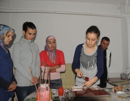 İskilip Meslek Yüksek Okulu öğrencileri, ebru dersini tasavvuf müziği dinleyerek yapıyor.