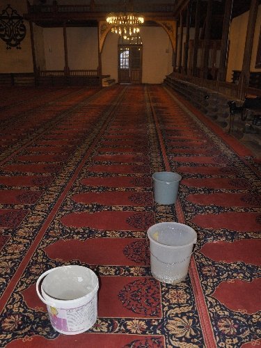 Bunun üzerine camii görevlileri damlaların düştüğü yere kovalar koyarak halıların ıslanmasını önlemeye çalıştı.