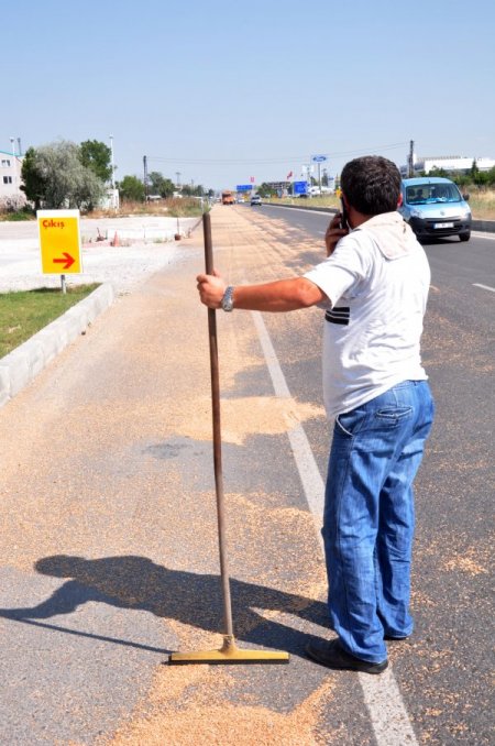 Kamyonun seyrettiği şeridin tamamen buğdayla kaplandığını yan aynalardan gören sürücü, güvenli bir şekilde aracını durdurdu. Araçtan inen sürücü kasanın arka kapağının açıldığını fark etti. Ancak yolun yaklaşık bir kilometrelik bölümü buğdayla kaplandı.