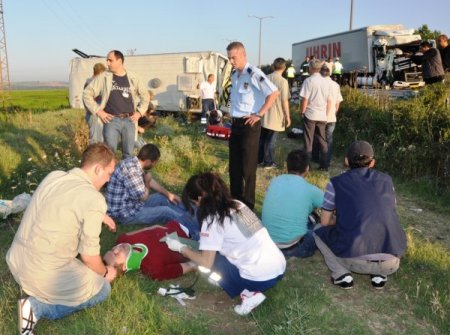 Edirne'de personel servis minibüsüyle TIR'ın çarpışması sonucu 11 kişi yaralandı.