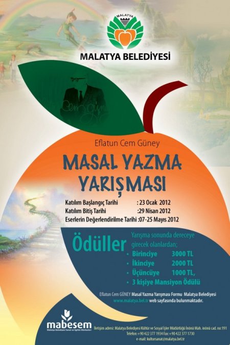 'Masal Baba' olarak tanınan Güney'in masal yazma tarzıyla yerli-yabancı değişik türdeki masallardan yararlanılarak, bu alanda yeni ve özgün eserler ortaya koyma, geleneğin yaşatılarak yeni kuşaklara aktarılmasını sağlama amacıyla düzenlenen yarışmanın son başvuru tarihi 29 Nisan 2012. Masal Yazma Yarışması'na başvuru, ''www.malatya.bel.tr'' internet adresinden yapılabiliyor.