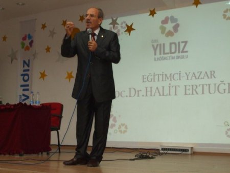 Özel Yıldız İlköğretim Okulu'nun konferans salonunda konuşan Halit Ertuğrul, günümüzde ailelerin karşı karşıya kaldığı en büyük sıkıntının eşler arasındaki itimat, saygı ve güven olduğunu vurguladı. Ertuğrul, bunun da çocuklara yansıdığını ifade etti.