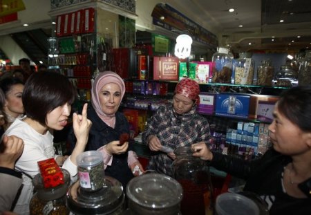 Başbakan Erdoğan'ın eşi Emine Erdoğan, kızı Sümeyye Erdoğan ile bakan eşleri de pazarı dolaştılar. Emine Erdoğan, pazardaki doğal ve bitkisel ürünleri inceleyerek satıcı ve kendisine eşlik eden Çinli yetkililerden bilgi aldı.