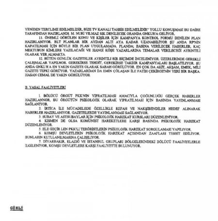 Bazı gizli bilgilerin (Libya'nın PKK'ya 10 milyon dolar vermesi, iki Alman PKK'lının yakalanması, PKK'nın Karadeniz'e açılımı) sadece Genelkurmay yanlısı gazetelere sızdırıldığının dile getirildiği belgede, Fatih Çekirge'nin her hafta birgün mutlaka Genelkurmay'a uğradığı, kesinlikle Genelkurmay'ın sözünün dışına çıkmadığı; ayrıca Türkiye Gazetesi'nden Sabahattin Önkibar'ın da Genelkurmay'a yakın olarak bilindiği belirtiliyor.