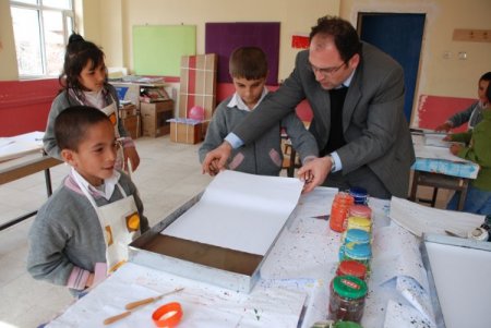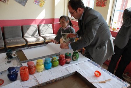 Halk Eğitim Merkezi'nde devam eden kursta, elleri fırça tutamayan zihinsel engelli öğrencilere öğretmeni yardımcı olurken, öğrencilerin birbirleri ile kaynaşıp, zihinsel ve fiziksel becerilerini geliştiriyor. 3 ay sürecek kurs sonunda engellilerin yaptığı ebru çalışmaları sergilenecek.