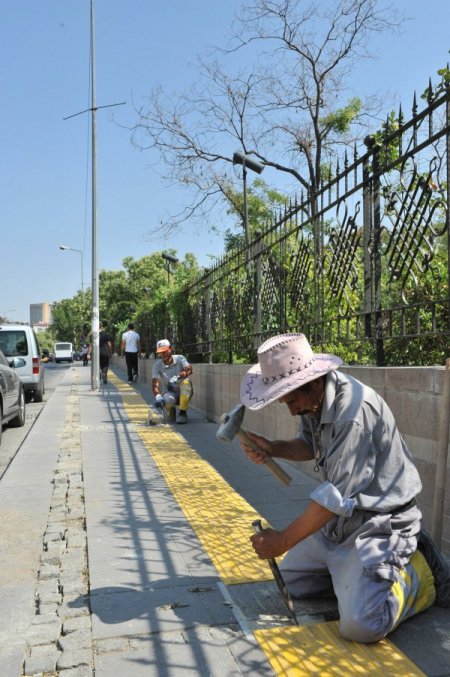Ankara’nın her bir karışının engellilerin hizmetinde olduğunu kaydeden yetkililer, “Görme engelli vatandaşlarımızın bir yerden bir yere erişimini kolaylaştırmak için kent içerisinde muhtelif cadde ve bulvarlarda yaklaşık 150 kilometre hissedilebilir yüzey çalışması yapıyoruz. Bu çalışmanın engelli vatandaşlarımız için tanımı ise ‘Güvenli Yol’ demektir. Proje kapsamında metro istasyonları, Ankaray istasyonları, AŞTİ ile muhtelif cadde ve bulvarlar bulunuyor” dediler. Başkent kaldırımlarını şimdiden sarı renge bürüyen çalışmalar kapsamında öncelikle güzergahların belirlenmesi için 3 ayrı ekibin görev aldığını, daha sonra ise Başkentlileri mağdur etmemek için geceleri, belirlenen güzergahlarda temizleme, yapıştırma ve son kontrol çalışmalarının yapıldığını kaydeden Kent Estetiği yetkilileri, “Bu çalışma da 15 ekip ile TSE’nin ilgili standartlarına uygun ve Özürlü ve Yaşlı Genel Müdürlüğü’nün gözetiminde titizlikle yapılıyor. " dedi.