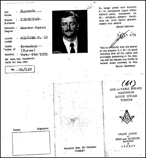 Klasörlerde, Ergenekon davası tutuklu sanığı Uludağ Üniversitesi eski Rektörü ve ADD Genel Başkan Vekili Prof. Dr. Mustafa Yurtkuran'ın mason olduğunu gösteren belge de yer aldı.