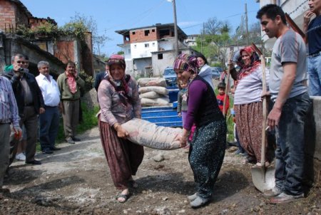 Köylere devlet tarafından yapılan yardımları değerlendirmeye alan köy halkı, çalışmalarını kendi imkânları ile yaparak hem köylerini güzelleştirmek için hem çamurlu tozlu yollardan kurtulmak için büyük çaba gösteriyor. Alaplı’ya bağlı Bektaşlı Köyü Kasırgollu Mahalle sakinleri, devlet millet işbirliğini sergileyerek köylerini güzelleştirme çalışmalarına başladı. Köydeki erkekler kadar kadınların da çalışmalarda boy göstermesi dikkatlerden kaçmadı. Patpat olarak adlandırılan tarım aracı ile kum ve çakıl çeken kadınlar, çimentoları taşıyarak harç yaptı. Bayanlar, ellerinin hamuru ile erkeklere destek oluyor.
