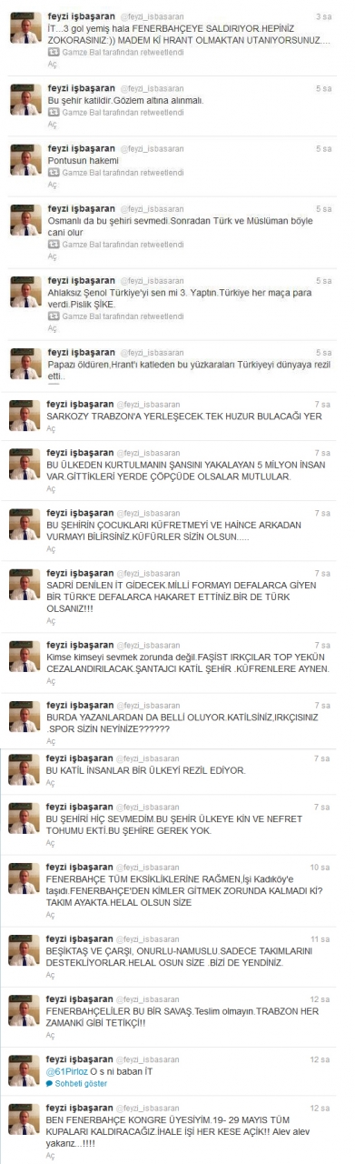 Star'ın haberine göre ; Ancak eski vekil Feyzi İşbaşaran'ın Trabzonspor, Teknik Direktör Şenol Güneş ve Trabzonspor Başkanı Sadri Şener'e yönelik attığı hakaret dolu twitler pes dedirtti.