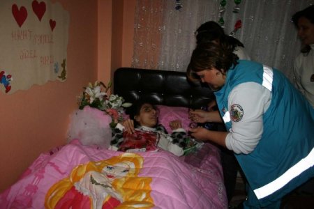 Bu kapsamda Gaziantepli 3 çocuklu bir ailenin en büyük kızı olan Burcu Yıldız da (22), evde bakım hizmeti alıyor. Doğduğunda Cerabral palsy hastası olan Burcu Yıldız’ın sol kalça çıkıklığı giderek gelişmiş. Nisan 2011’ye kadar elinden tutularak geçmesine rağmen, 2 büyük 4 yan olmak üzere geçirdiği 6 osteonekroz ameliyatından sonra tamamen yatağa bağlı kalmış. 20 Mayıs 2011’de Dr. Ayten Bozkaya Spastik Çocuklar Hastanesi Rehabilitasyon Merkezi Evde Sağlık Hizmetleri Birimine kaydı yaptırılan Yıldız’in tedavisine evde devam edilmeye başlanmış. Evde pansuman hizmetleri başta olmak üzere, fizyoterapist ve diyetisyen ziyaretleri yapılmakta. Babası asgari ücretle işçi olarak çalışan Burcu Yıldız’ın annesi ise ev hanımı. Kiralık evde oturan ailenin bir çocuğu üniversite diğeri ise ilköğretimde okuduğu için istemeleri halinde dahi hastaneden gerektiği kadar yararlanamadıkları belirtildi.