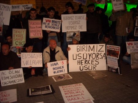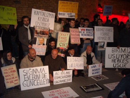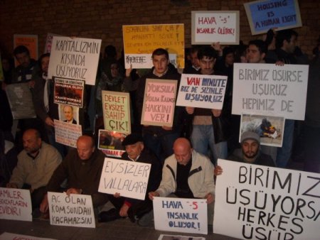 Çeşitli sivil toplum örgütü üyesi yaklaşık 50 kişi, saat 22.00 sıralarında Taksim Meydanı’nda toplandı. Grup, kış mevsiminin yaklaşması sebebiyle, sokakta yaşayan evsizlerin barınma sorununa dikkat çekmek amacıyla ‘Birimiz üşüyorsa herkes üşür’ sloganıyla eylem yaptı. ‘Evsizler villalara’, ‘Üşüten devlet istemiyoruz’, ‘Bir kişi üşüyorsa herkes üşür’, ‘Aç olan komşundan kaçamazsın’, ‘Van minute biz de sizinle üşüyoruz’, ‘Hava -5 insanlık ölüyor’, ‘Herkes bir yatağı hak eder’, ‘Devlet evsizlere sahip çık’ yazılı dövizler taşıyan grup, Taksim Meydanı’nda basın açıklaması yaptı.