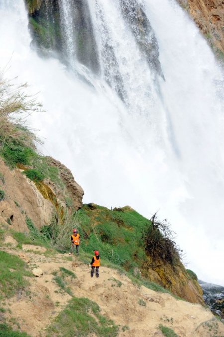 Düden Şelalesi’nin denize döküldüğü noktada gerçekleştirilen temizliğe Büyükşehir Belediyesi temizlik işçileri ile TODOSK üyeleri katıldı. Halatlarla yaklaşık 40 metrelik falezlerden aşağı inen TODOSK üyeleri, topladıkları çöpleri yine halat yardımıyla ve denizden tekneyle çalışmalara katılan işçilere verdi. Turistlerin meraklı bakışları arasında gerçekleştirilen temizlikte, Büyükşehir Belediyesi yetkilileri vatandaşları çevre konusunda daha duyarlı olmaya davet etti.