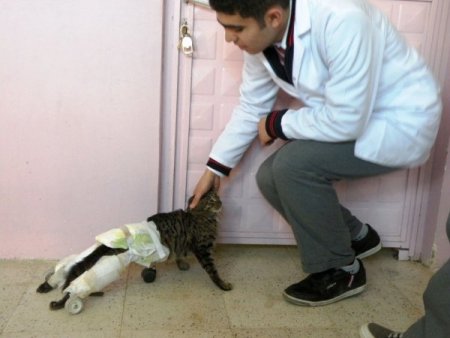 Erzincan'da trafik kazası sonucu arka iki ayağı felç olan kedi, öğrenciler tarafından geliştirilen tekerlekli protez sistemi ile hayata tutundu. Erzincan’da trafik kazası sonucu bir kedinin arka iki ayağı felç oldu. Kaza sonrası Tarım Meslek Lisesi’ne getirilen kedinin yaşamının sürdürmesinin imkânsız olduğu düşünülerek hayatının sonlandırılması gerektiği belirtildi. Ancak devreye giren Ziraat Meslek Lisesi Veterinerlik Bölümü öğrencileri Kurtuluş Karakuş ve Akın Yılmaz, kedinin yürüyebilmesi için tekerlekli protez sistemi geliştirdi. Danışman Öğretmen Nurullah Türker’in öncülüğünde ‘Onun Arabası Var’ adı verilen projeyle kedi hayatını sürdürebilir konuma geldi. Bu proje aynı zamanda meslek liseleri arasında yapılan yarışmada okulun önce Erzincan il birincisi, daha sonra ise Malatya’da bölge birincisi olmasını sağladı. Erzincan Tarım Meslek Lisesi öğrencileri, 4 -8 Nisan tarihleri arasında Ankara’daki Türkiye finalinde şampiyon olmayı hedefliyor. Projeyi geliştiren Kurtuluş Karakuş ve Akın Yılmaz, hayvan sevgisinin geliştirilmesine ve bir kedinin hayata döndürülmesine vesile oldukları için son derece mutlu olduklarını belirtti. Okul Müdürü Fahrettin Cenk ise okul idaresi olarak öğrencilerin Ar-Ge çalışmalarında bulunmasına katkı verdiklerini dile getirdi. CİHAN