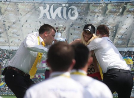 Ukrayna’nın başkenti Kiev merkezli Femen'in 23 yaşındaki üyesi Yuliya Kovpaçik yaptığı tek kişilik eylemde, Euro 2012 kupasını yere fırlatarak kupaya zarar verdi. Yarı çıplak gösterileriyle adlarından sık söz ettiren gurubun üyesi şehir merkezindeki Bağımsızlık Meydanı'na kupanın yerleştirildiği sırada güvenlik güçleri engelini aşarak kupayı yere fırlattı.