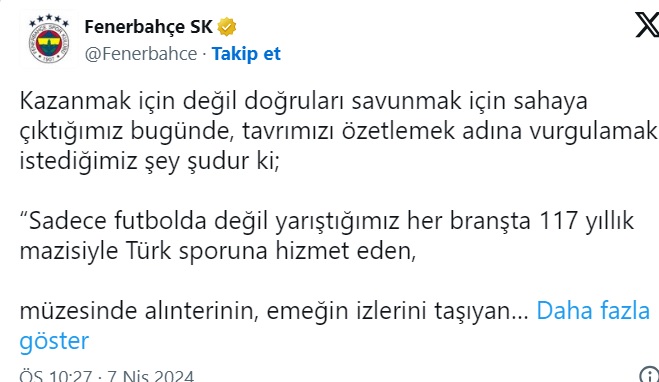 "Kazanmak için değil doğruları savunmak için sahaya çıktığımız bugünde, tavrımızı özetlemek adına vurgulamak istediğimiz şey şudur ki; sadece futbolda değil yarıştığımız her branşta 117 yıllık mazisiyle Türk sporuna hizmet eden, müzesinde alın terinin, emeğin izlerini taşıyan binlerce kupası olan, 30 milyon taraftarıyla ülkesinin milli değerlerini benliğinde hisseden dünyanın en büyük spor kulübü olarak dün olduğu gibi bugün ve yarınlarda da dik durmaya devam edeceğiz."