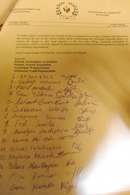 Etkinlikte konuşan Finlandiya Azerbaycanlılar Derneği Başkan Yardımcısı Arzu Oktay, Fransa devletine ve Fransa Anayasa Mahkemesi’ne Finlandiya'daki Fransız elçiliği aracılığıyla iletilmek üzere tüm katılımcıların imzasını alarak bir mektup göndereceklerini söyledi. Oktay, “Bu mektubumuzda mahkeme heyetine 'olmayan soykırımı kabul etmek yerine 20. asır gibi yakın bir zamanda gerçekleşmiş Hocalı soykırımına bakılmasını ve tanınmasını sizlerden talep ediyoruz.' diye yazdık. Biz Finlandiya'da ki yaşayan Azerbaycan ve Türkiye halkları başta olmak üzere tüm Dünya'dan bu şekilde gelecek mektuplar neticesi Fransız mahkemelerinin kayıtsız kalamayacağına inanıyoruz. Netice olarak ermeni soykırımına dair çıkarttıkları kanunu kaldıracaklarını düşünüyoruz. Azerbaycan milletvekillerinin de imzalı başvuruları olmuş olacak.