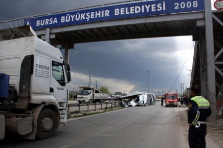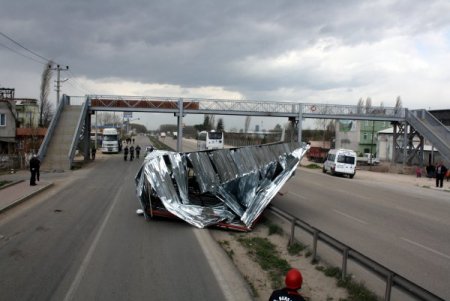 Millet Mahallesi'nde üst geçit yanında kendisi için küçük bir atölye yapmayı düşünen İsmail Y., dün çatı saçlarından derme çatma bir baraka yaptı. Profillerle yere tutturulan çatı baraka, bugün sabah saatlerinde etkili olan şiddetli rüzgar sebebiyle yerinden koparak Yakın Çevre Yolu'na savruldu. Yuvarlanarak ilerleyen dev saç yığını, bu sırada kaldırımda yürüyen 51 yaşında Şeref Bayram'ın üzerine düştü. Saç yığını daha sonra yoldan geçen Hüseyin Yılmaz yönetimindeki 16 LC 395 plakalı minibüse çarpıp, yolun ortasındaki bariyere takılarak durabildi. Araç sürücüsü Yılmaz, çatının büyük bir hızla yola geldiğini fark edip frene bastığını, ancak duramayınca minibüsün arka kısmına çarpıp hasara sebep olduğunu söyledi.