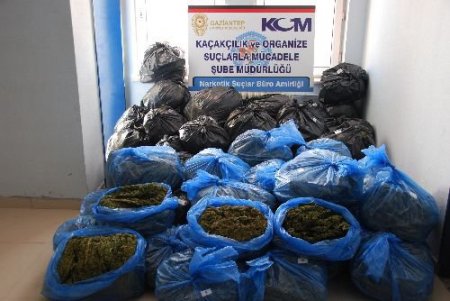 Gaziantep şehir girişinde durdurulan iki araçta yapılan aramada, 322 kilogram esrar bulundu. Bir ihbarı değerlendiren Gaziantep Emniyet Müdürlüğü Kaçakçılık ve Organize Suçlar Şube Müdürlüğü Narkotik Büro Amirliği ekipleri, şehir girişinde iki aracı durdurdu. Araçlarda yapılan aramada yaklaşık 322 kilogram esrar ele geçirildi. Araçta, 1 adet ruhsatsız tabanca, bu tabancaya ait şarjör ve 6 adet mermi ele geçirildi. Olayla ilgili Şahin Ç., Sebih A. ve Ati Ertuğrul B. gözaltına alındı. Zanlılardan Ati Ertuğrul B.'nin 3 farklı suçtan emniyette kaydının bulunduğu öğrenildi.