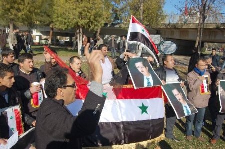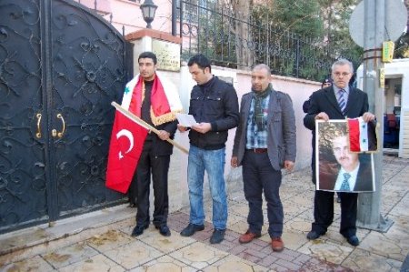 Konsolosluk karşısında toplanan Suriyeliler, iki ülke bayrakları ve Beşar Esed posterleri açtı. Esed lehine slogan atan esnaflar, birlik mesajları verdi.