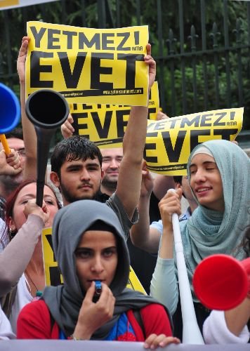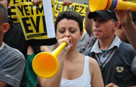 Yaklaşık 30 kişiden oluşan Genç Siviller Galatasaray Meydanı'nda söz konusu kararı protesto etti. Güney Afrika'da oynanan Dünya Futbol Kupası'nda stadda çalınan ve rahatsızlık verdiği gerekçesiyle kupanın istenmeyen enstrümanı ilan edilen vuvuzellayı çalan grup ilginç görüntüler oluşturdu. 'Yetmez ama evet' yazılı döviz taşıyan grup, 'Darbeci yargı istemiyoruz' diye slogan attı.