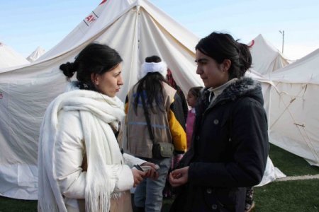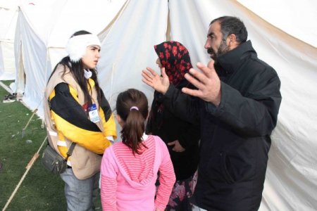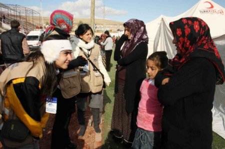 İlçe stadına kurulan çadırkenti gezen psikologlar, yakınlarını kaybeden kadınlar ve çocuklarıyla görüşerek psikolojik destek vermeye çalıştı. Depremzede bazı kadınlar, yaşadıkları acıyı psikologlarla paylaşırken gözyaşlarını tutamadı. Beş gün süreyle bölgede kalacak olan psikologlar, depremzedelere normal yaşantılarına dönmelerinde yardımcı olmaya çalışacak.