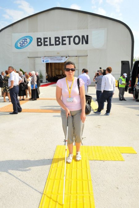 iki gün süren çalıştayda, üretici firmaların ürettiği farklı şekil ve ebatlardaki cadde, sokak ve mahallelere döşenecek kabarık yüzey şekilleri BELBETON Fabrikası’nın bahçesinde oluşturulan bir alana konularak, kullanıcıları olacak engelliler tarafından test edildi.