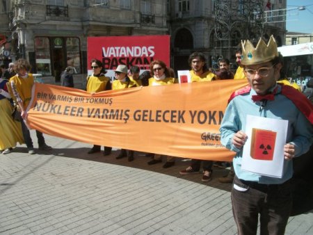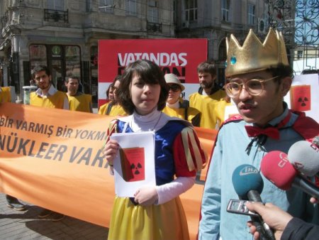 Greenpeace gençlik ekibi, hükümetin nükleer santral planlarını protesto etmek için velileri ile birlikte Beyoğlu Tünel Meydanı’nda toplandı. Masal kahramanlarının kostümlerini giyen Greenpeace ekibi, “Bir varmış bir yokmuş, nükleer varmış gelecek yokmuş” yazılı pankart açtı.
