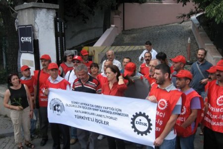 Beşiktaş’taki konsolosluk binası önüne gelen protestocular, 'Güney Afrika’da grev yaptıkları için öldürülen işçiler sınıf kardeşlerimizdir. Katliamcıları lanetliyoruz' yazılı pankart açtı. Eylemciler 'Yaşasın enternasyonal dayanışma', 'İşçilerin birliği sermayeyi yenecek' şeklinde slogan attı.