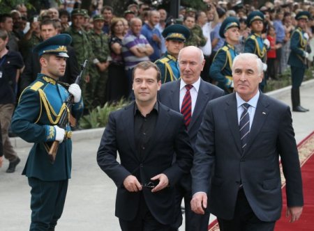 Guney Osetya halkı, Cumhurbaşkanlık Sarayı önünde Medvedev’in alkışlayarak karşıladı. Saray girişinde Medvedev’i Guney Osetya Cumhurbaşkanı Leonid Talibov karşıladı. Medvedev’e tuz ve ekmek ikram edildi.