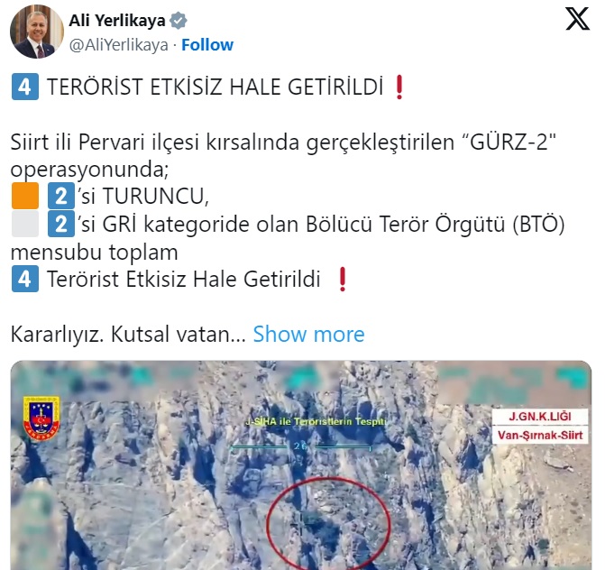 BAKAN ALİ Yerlikaya, sosyal medya hesabından yaptığı açıklamada, operasyonda etkisiz hale getirilen teröristlerden "Benda Amed" kod adlı Semra Ayverdi ile "Baran Hemlin" kod adlı Seyithan Sencer'in turuncu, "Sarı İbrahim" kod adlı Yakup Nişo ile "Destina Botan" kod adlı Bişenk Durmuş'un gri kategoride arandığının tespit edildiğini belirtti.