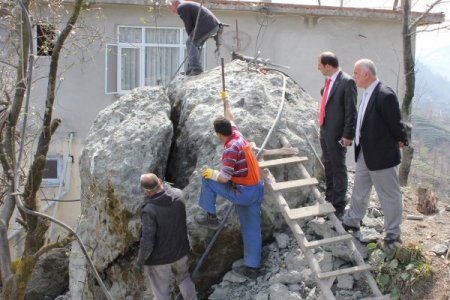 Rize'nin Gündoğdu beldesinde yerinden hareket edince yuvarlanıp evlere zarar vermemesi için çelik halatlarla ağaca bağlanan yaklaşık 400 tonluk kayadan 10 tonluk parça kopartıldı.