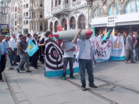 HAS Parti üyesi yaklaşık 200 kişilik grup, Galatasaray meydanında toplandı. ‘Artık açık bir hedefiz farkında mısınız’ yazılı pankart açan grup, temsili füze maketi ile İstiklal caddesi üzerinden Taksim’e doğru yürüyüşe geçti. Has Partililer yürüyüş boyunca ‘Katil İsrail’ , ‘NATO füzeni al başına çal’ , ‘Emperyalist Amerika Ortadoğu’dan defol’ şeklinde sloganlar attı.