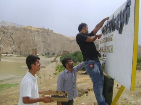 Türkçe, Kürtçe, Arapça ve İngilizce yazı ile “Hasankeyf’e hoş geldiniz” tabelasının ilki ekim 2010'da Hasankeyf köprü başına monte edilmişti. Ancak tabela bir hafta sonra kimliği meçhul kişilerce monte edildiği yerden gece sökülmüştü, ikincisi, Mart 2011'de monte edilen tabelanın 3 ay sonra yazıları okunmayacak şekilde tahrip edilmişti.