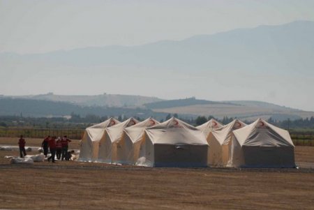 Apaydın köyüne kurulacak çadır kent tel örgülerle çevriliyor. Elektrik şebekesi döşeme çalışmalarının yanı sıra asfaltlama çalışmaları da devam eden bölgede Kızılay ekipleri çadırların kurulması için çalışmalarını yoğunlaştırdı.