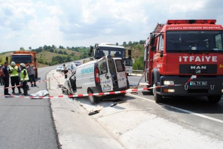 Yol çalışması nedeniyle bölünen yolda, İstanbul istikametine giden Mithat Hatlı yönetimindeki beyaz eşya servisine ait 81 BZ 320 plakalı panelvan, karşı yönden gelen Şahin Güneş'in kullandığı 54 B 1471 plakalı kamyonla çarpıştı. Kazada panelvan sürücüsü Mithat Hatlı ile yanında bulunan Gürkan Terzioğlu araç içerisinde sıkışarak hayatını kaybetti. İki kişinin cesedi, itfaiyenin çalışması sonucu çıkartıldı. Kaza Cumhuriyet savcısının yaptığı incelemenin ardından Hatlı ve Terzioğlu'nun cesetleri, Hendek Devlet Hastanesi morguna kaldırıldı.