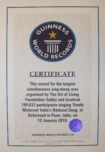 Hindistan'ın Yaşama Sanatı Derneği tarafından organize edilen ve dünyanın en kalabalık 104 bin 637 kişilik dev korosu, Guinness dünya rekorlar kitabına girmeye hak kazandı. Bu yıl 12 Ocak'ta Hindistan'ın üniversiteler şehri Pune'de organize edilen Atarnaad adlı programda dev koro Hindistan'ın milli şarkısı "Vande Mataram"ı toplu halde söylemişti. Şarkı söyleyen sanatçılar arasında Shankar Mahadevan, Pandit Rajan, Sajan Mishra gibi Hindistan'da bilinen isimler de bulurken, organizasyon bu kadar sanatçının bir araya getirilmesi adına bir ilk niteliği taşıyor. 105 bine yakın kişiyi bir araya getirmeyi başaran Yaşama Sanatı Derneği, amaçlarının müzik ve maneviyatı bir araya getirerek, depresyonlarla dolu hayata bir renk katmak olduğunu açıklamıştı. Dernek başkanı ve manevi lideri Ravi Shankar, Hindistan'da müritleri ile organize ettiği dev bütçeli organizasyonlarla biliniyor. Shankar'ın 2,5 milyon kişi katılan doğum günü organizasyonu için 50 milyon dolar harcanmıştı. Yaşama sanatı derneği daha önce de 1200 Mohiniattam dansçısını Kerala eyaletinde 2006 yılında bir araya getirerek ve 2008 yılında 1094 Sitar sanatçısını bir araya getirerek Guinness dünya rekorları kitabına girmişti.