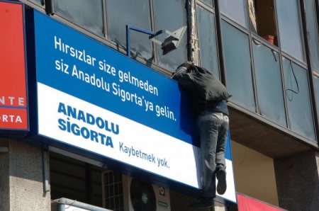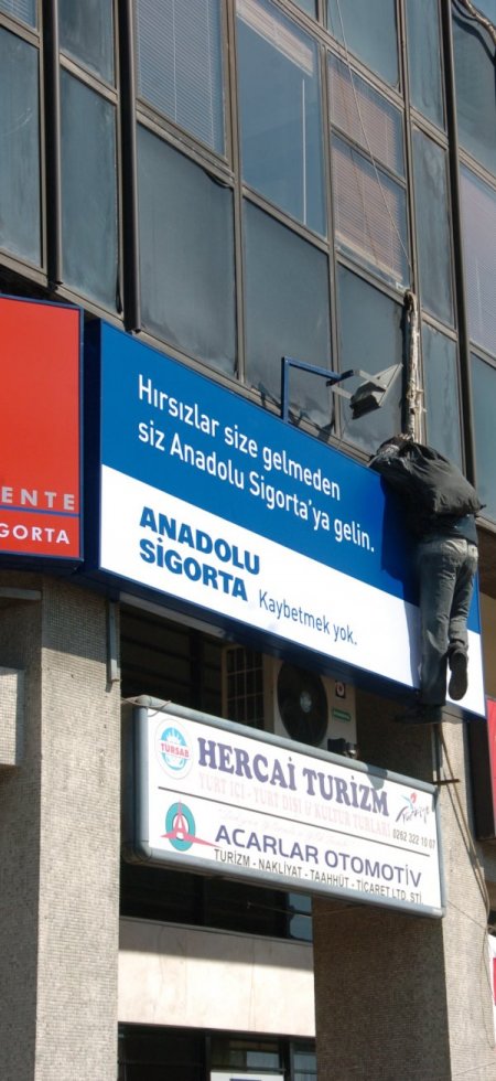 Bir sigorta şirketi, hırsızlığa karşı yaptığı sigortayı en kısa yoldan anlatabilmek için ilginç bir yol buldu. D-100 kara yolu üzerindeki Fazlıoğlu İşhanı\'nın 3. katında faaliyet gösteren sigorta acentesi, işyeri tabelasında işyerine girmeye çalışan bir hırsız maketi kullandı. Maketin işletmenin camından aşağıya sarkmış olarak bırakılması, görenleri gerçek bir hırsız olduğu yanılgısına düşürüyor. Maketi gördüklerinde hemen 155 Polis İmdat\'ı arayan pek çok vatandaşın işyerine hırsız girdiği ihbarında bulunduğu, bugüne kadar emniyete 30 civarında ihbar yapıldığı öğrenildi.