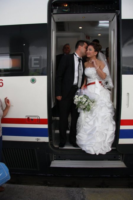 İlköğretim okulu öğretmeni Göknil Yardımcı ile Ziraat Mühendisi İlker Bağcı’nın aşkları yaklaşık bir yıl önce Eskişehir-Ankara arasında Yüksek Hızlı Tren ile seyrederken başladı. Trende tanışmalarının ardından birbirlerine aşık olan Göknil ile İlker bir süre önce yaşamlarını birleştirme kararı aldı. Dün Ankara’da kıyılan nikahın arkasından hızlı tren ile yaşayacakları kent Eskişehir’e geldiler. Hızlı tren çalışanları, gelin ile damada özel servis yaparken, yakınları da Eskişehir tren garında gelin ile damadı alkışlarla karşıladı.