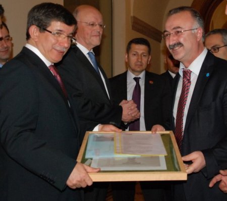 Hollanda’nın Rotterdam şehrinde temaslarda bulunan Dışişleri Bakanı Ahmet Davutoğlu’na Demokratik Sosyal Dernekleri Federasyonunu (DSDF) Başkanı Zeki Baran “Göçmen İşçi Anıtı” rsmini verdi.