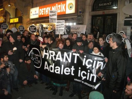 'Katil devlet hesap verecek’, ‘Bu dava böyle bitmeyecek’, ‘Faşizme inat kardeşimsin Hrant’, ‘Hepimiz Hrantız hepimiz Ermeniyiz’, ‘Öldür diyenler yargılansın’, ‘Hrant için adalet için’, 'Faşistler vuruyor AKP koruyor' şeklinde sloganlar atan grubun Agos önünde bekleyişi sürüyor. CİHAN