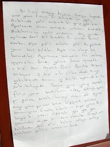 Silah sesinden yarım dakika sonra bir ambulans ve bir polis arabasının geldiğinin anlatıldığı mektupta, "Orada bulunanlar hiçbir yere telefon etmedi. Ama birine telefon geldi. Ambulans ve polis arabasının sokağın başında bekliyor olması lazımdı. Yoksa bu kadar kısa süre içinde gelmesi mümkün değildi. Sadece yarım dakika içinde geldiler. Orada bekleyenlerden uzun boylu bıyıklı olanı polis arabasına bindi. Bu kişi dışarıda arabanın biraz uzağında duran bir poşetin içinde bir hediye paketi alıp kazağının altına koydu. Poşet boş olarak orada bırakıldı. Bir kişiyi sedyeye koydular. Sedyeye koymadan önce yatan kişinin iki koluna iğne yaptı. Ambulans da polis arabası da bir garip geldi bize, apartmanda oturan çocuğu da ambulansa bindirdiler. Ambulansın ve polis arabasının olay yerinden ayrılışında saat bir buçuktu. Bu araçlar hareket ederken diğer araçlar geldi. Bu polisler de yarım saat kaldılar. Ayak izine etrafa hiç bakmadılar, hiç inceleme yapmadılar. Savcı gelmedi. Sonra öğrendik ki o kişi Özel Harekât Daire Başkanı Behçet Oktay'mış. O kişi asla intihar etmedi, oraya getirildiğinde durumu iyi değildi. Ayakta o iki kişi (tarafından) zorla tutuluyordu. Sonra yere yatırıp öldürdüler. Polis yarım saat sonra arabayı çekiciyle çekti. Bir polis de kürekle her şeyi alabora etti. O gece oraya gelen polisler bizim bildiğimiz polislere benzemiyordu. Gazete haberlerinin hepsi yalan. Böyle büyük bir adamı öldürdüler, göz göre göre gözümüzün önünde bir adam öldürüldü. Cinayet var. Katillerin ikisi elini kolunu sallaya sallaya ambulansa polisin arabasına bindi." ifadeleri kullanıldı. CİHAN