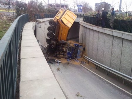 Maltepe’de, sürücüsünün çalışır vaziyette terk ettiği kum yüklü hafriyat kamyonu, freni boşalınca köprüden aşağı uçtu. O sırada kamyonun düştüğü yoldan geçmekte olan İşçi dolu servis minibüsü, kamyonun altında kalmaktan son anda kurtuldu.