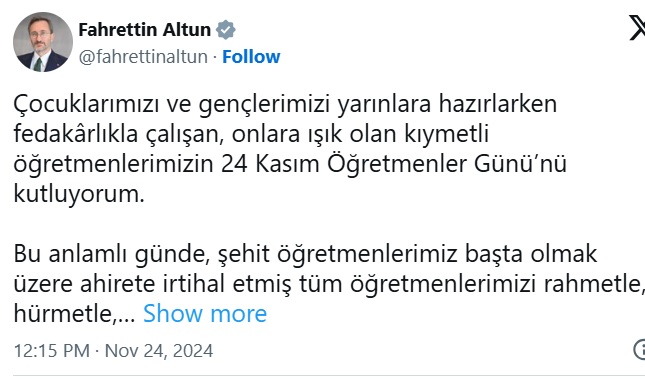 FAHRETTİN Altun, sosyal medya hesabından yaptığı paylaşımda, "Çocuklarımızı ve gençlerimizi yarınlara hazırlarken fedakarlıkla çalışan, onlara ışık olan kıymetli öğretmenlerimizin 24 Kasım Öğretmenler Günü'nü kutluyorum. Bu anlamlı günde, şehit öğretmenlerimiz başta olmak üzere ahirete irtihal etmiş tüm öğretmenlerimizi rahmetle, hürmetle, hasretle yad ediyorum." ifadelerini kullandı.