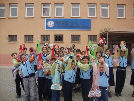 Erzurum'un Pazaryolu ilçesinde 75. Yıl Yatılı Bölge İlköğretim Okulu (YİBO) öğrencileri naylon poşet kullanımının önüne geçmek amacıyla esnafa file dağıttı.