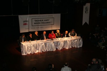Uluslararası Plastik Sanatlar Derneği (UPSD) tarafından Beşiktaş Akatlar Kültür Merkezi'nde düzenlenen panelde 'İnsanlık Anıtı' etrafından dönen tartışmalar ele alındı. Panelin başlangıcında Fazıl Say mini bir konser verdi. Programa; Tarık Akan, Eyüp Muhcu, Ercan Karakaş, Bedri Baykam, Mehmet Aksoy, Turgut Kazan konuşmacı olarak katıldı. Panele konuşmacı olarak katılan İnsanlık Anıtı heykelinin mimarı Mehmet Aksoy, yaptığı eserin Kars Belediyesi tarafından tanındığını ancak Başbakan Eroğan'ın, "Ucube" değerlendirmesinden sonra heykele sahip çıkılmadığını söyledi. Aksoy, yaptığı eserin kaçak bir eser olmadığını ve kesinlikle sit alanı içinde yer almadığını ifade etti. Belediyenin Başbakan Erdoğan'ın lafından sonra sahip çıkmadığı heykelin temellerini belediye işçileriyle birlikte attıklarını kaydeden Aksoy, fotoğraflarla heykelin yapım aşamasındaki çalışmalarını gösterdi. CİHAN