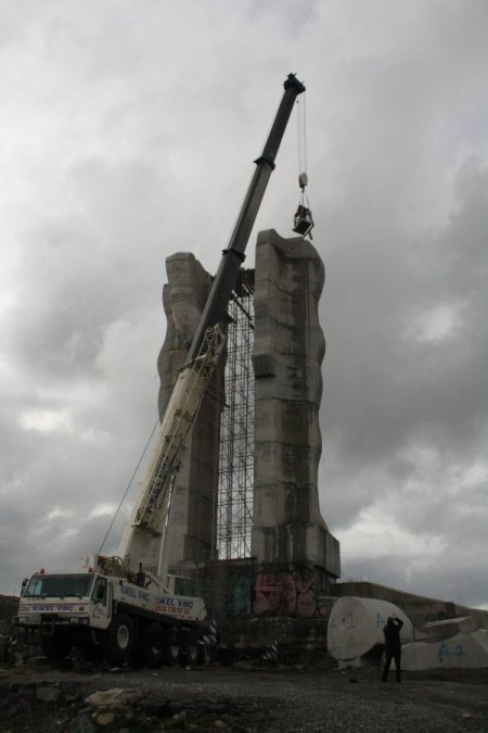 Başbakan Recep Tayyip Erdoğan’ın 'ucube' diye nitelendirdiği İnsanlık Anıtı'nda çalışmalar sürüyor. Çalışmaları hava şartları da olumsuz yönde etkiliyor. Kars'ta bir haftadır devam eden yağışlar ve rüzgar anıtta yapılan çalışmaları önemli ölçüde aksatıyor. Geçen salı başlanan çalışmalarda gelinen nokta ise her iki figürün toplamda 40 ton olan başlarının sökülmesi ve sırtı Kars kalesine bakan figürün karşısındakinin 27 ton olduğu belirtilen omzunun sökülmesi oldu.