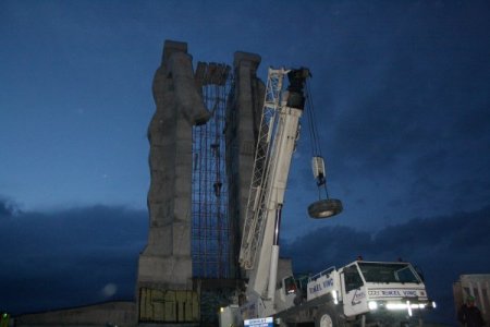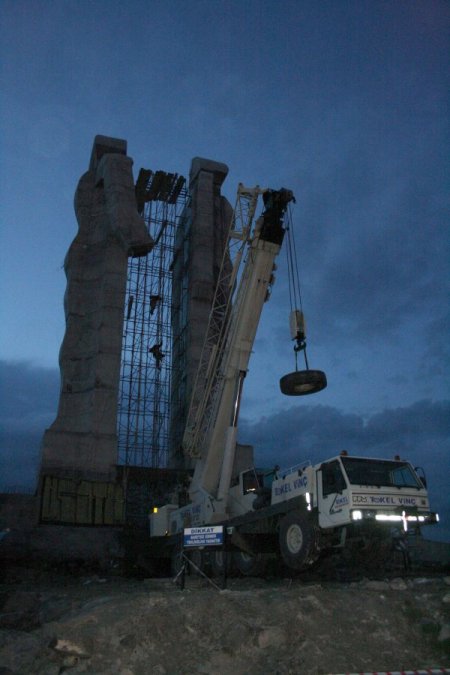İnsanlık Anıtı'nın kesimine elmas kablonun kopması, akşam karanlığının çökmesi, rüzgarın hızını artırması ve soğuk hava engel oldu.