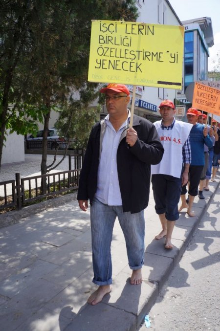 Çankaya Belediyesi Fen İşleri Genel Müdürlüğü’nde çalışan 500 kadrolu çalışanı, belediyenin temizlik işlerini taşeron firmalara vermek istemesini protesto etti. Fen İşleri Genel Müdürlüğü’nde toplanan grup üyeleri, ‘İşçilerin birliği özelleştirmeyi yenecek’, ‘Özelleştirme ilkelerin neresinde var?’, ‘Özelleştirmecileri işyerimize sokmayacağız’ dövizleri taşıdı. Toplanan işçilerden bazıları Sakarya Caddesi’nde toplanmak üzere buradan araçla ayrılırken, yaklaşık 30 kişi ise eylemin ses getirmesi için çıplak ayakla yola çıktı.