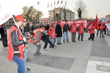 Bugün Düzce Anıt Parkta bir araya gelen 112 sendikalı işçi, Birleşik Metal İş Sendikası Örgütlenme Daire Başkanı Özkan Atar’ın da katılımıyla bir basın açıklaması düzenlendi. Basın açıklaması öncesi çalan müzik eşliğinde sendikalı işçiler hep birlikte horon tepip halay çektiler. Daha sonra işçiler adına basın açıklamasını Özkan Atar yaptı. Atar, Düzceli işçileri birbirine kırdırmak için yapılan bu oyuna gelmeyeceklerini belirtti. İşçiler” Düzce köle pazarı değildir, hainler elinizi MASDAF’tan çekin, satılmış medya, satılmış işçi istemiyoruz, Babalar işsiz çocuklar aç, Anayasal hakkımız engellenemez, Metal işçileri köle değildir.” yazılı dövizlerle slogan atıp, işten atılan işçilerin haklarının verilmesini ve işe geri alınmalarını istediler.