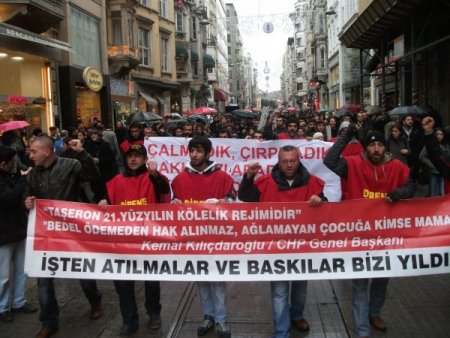 CHP’li Maltepe Belediyesi’nden atılan taşeron işçiler, belediyeyi protesto etmek için Taksim Meydanı’nda toplandı. ‘Taşeron 21. Yüzyılın kölelik rejimidir. Bedel ödemeden hak alınmaz. Ağlamayan çocuğa kimse mama vermez. Kemal Kılıçdaroğlu-CHP Genel Başkanı. İşten atılmalara ve baskılar bizi yıldıramaz’ , ‘Çalmadık çırpmadık hakkımızı aradık işten atıldık’ yazılı pankartlar açan işçiler, İstiklal Caddesi üzerinden yürüyüşe geçti. İşçiler yürüyüş boyunca ‘Taşeron işçisi direnişin simgesi’ , ‘Zafer direnen emekçinin olacak’ , ‘Çalmadık çırpmadık akımızı aradık’ , ‘Başkanlar sarayda işçiler sokakta’ , ‘İşçiyiz haklıyız kazanacağız’ , Atılan işçiler geri alınsın’ şeklinde sloganlar attı.